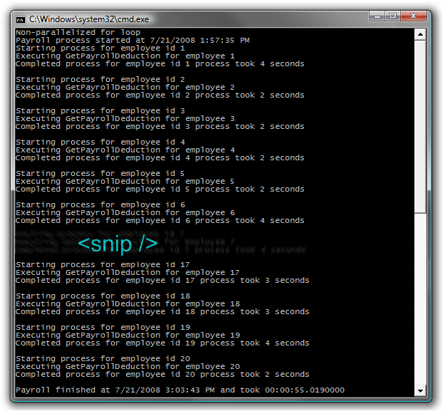 6. Build and run the application. 7. You should see that the employees are all processed in order of their IDs, similar to the following (the exact time to complete will vary):