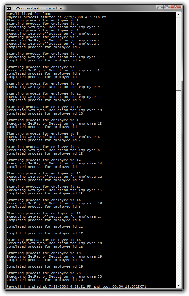 10. Build and run the application. 11. You should observe that the employees are not necessarily processed in the order of their IDs. You’ll also notice that multiple calls to the GetPayrollDeduction() method are made before the first call returns. And finally, you should observe that by running the calls in parallel, the entire job completed much faster than when run in serial.