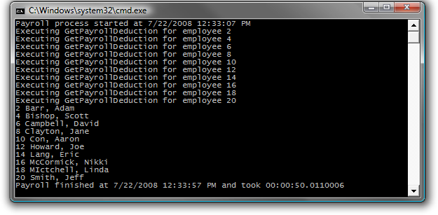 5. Build and run the application. 6. You should observe that the LINQ query performs the operations in order of the Employee ID. Also observe the total amount of time required to complete the work (the exact time required will vary): Figure 13 Output from a non-parallelized LINQ query