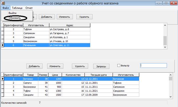 Разрабатываемое приложение предназначено для учета поставок медикаментов. Система должна хранить, добавлять, изменять и удалять информацию об ассортименте обуви: ее наименовании, размере, цене и количестве, а также об изготовителе: названии фирмы и ее адресе. Система должна поддерживать следующие функции: - отображать информацию об ассортименте имеющейся обуви - идентификатор ассортимента, наименование обуви, размер, цену, количество, текущую дату; - отображать информацию об изготовителе обуви - идентификатор изготовителя, название фирмы, ее адрес; - формировать сведения об ассортименте обуви; - формировать сведения об изготовителе обуви; - осуществлять запросы к базе данных; - формировать отчетные документы. Тестовый пример 1. Проверка функции учет информации о производителях. При запуске приложения на экране появится главное окно приложения (Рисунок Б.1). Таблица изготовителя будет уже заполнена данными об изготовителе. Чтобы заполнить таблицу изготовителя, необходимо заполнить все соответствующие поля, для этого щелкнуть по кнопке «Добавить». Откроется новое окно приложения, в которое нужно будет ввести необходимые данные и нажать кнопку «ОК» (Рисунок Б.2). Чтобы обновить данные в таблице, следует нажать кнопку «Обновить», в результате чего информация в таблице изготовителя будет обновлена (Рисунок Б.3). Для изменения какой – либо записи таблицы, требуется нажать на кнопку «Изменить» и внести необходимые изменения записи, после чего нажать «ОК» (Рисунок Б.4). Записи из таблицы можно также и удалять. Для этого требуется выделить необходимую запись и нажать на кнопку «Удалить». После этого откроется окно с предупреждением, нужно ли удалять данную запись или нет (Рисунок Б.5). Требуется сделать выбор, нажав на кнопку «Да» или «Нет» (Рисунок Б.6). Тестовый пример 2. Чтобы начать работу с таблицей ассортимент, требуется использовать кнопки «Добавить», «Изменить», «Удалить», «Запросы», а также использовать поле «Фильтр» для фильтрации информации в таблице. Для добавления записи в таблицу требуется использовать кнопку «Добавить» (Рисунок Б.7). При нажатии на эту кнопку осуществляется добавление записи в таблицу ассортимента (Рисунок Б.8). После открытия формы для добавления новой записи, требуется заполнить соответствующие пустые поля «Товар», «Размер», «Цена», «Количество», поле «Текущая дата» заполняется автоматически датой на настоящее время, но если требуется, то можно выбрать другую дату (Рисунок Б.9). После чего, необходимо нажать на кнопку «ОК» (Рисунок Б.10), либо «Отмена» (Рисунок Б.11).