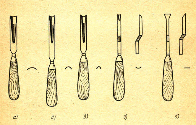 Стамески и их поперечное сечение: а - царазик, б - средняя, в - крутая, г - уголок, д - клюкарза Царазики - инструмент для выборки узких полукруглых выемок, выполнения прожилок и обработки перехода фона в край орнамента, а также для разных мелких работ. По своей форме они похожи на узкие полукруглые стамески с большой (больше полукруга) глубиной изгиба. Размеры царазиков различны в зависимости от назначения.