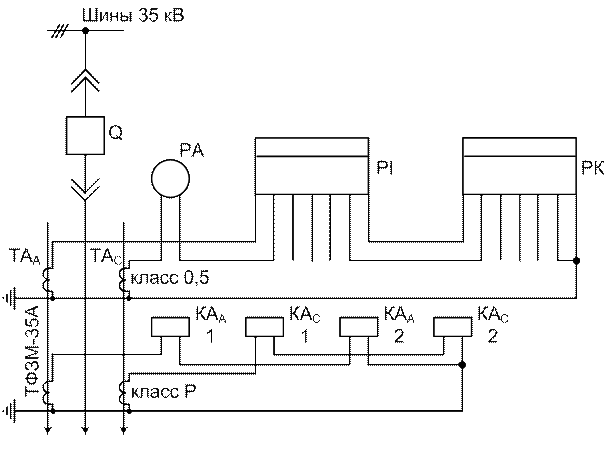 Исходя из того, что выполняются условия электродинамической и термической стойкости следует, что выбранный трансформатор тока осталось проверить по классу точности. Для проверки трансформатора тока по классу точности составляется расчётная схема, на которой указываются количество и способ подключения приборов, а также схема соединения измерительных трансформаторов тока. Проверка производится по одной наиболее загруженной фазе. Расчётная схема трансформаторов тока при проверке по классу точности имеет следующий вид:
