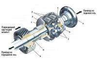 Ведущий вал передает крутящий момент от коробки передач к раздаточной коробке. Межосевой дифференциалпредназначен для распределения крутящего момента между осями и позволяет им вращаться с разными угловыми скоростями. Межосевой дифференциал может быть симметричным и несимметричным. Симметричный дифференциал распределяет крутящий момент между осями поровну, несимметричный – в определенном соотношении. В раздаточных коробках, используемых в системах полного привода подключаемого автоматически и полного привода подключаемого вручную межосевой дифференциал, как правило, не применяется. Для полной реализации полноприводных возможностей предусматривается блокировка межосевого дифференциала. Под блокировкой межосевого дифференциала понимается полное или частичное выключение дифференциала, обеспечивающее жесткое соединение передней и задней осей между собой. Блокировка может осуществляться автоматически или вручную. Современными механизмами автоматической блокировки межосевого дифференциала являются вискомуфта, самоблокирующийся дифференциал Torsen, многодисковая фрикционная муфта.