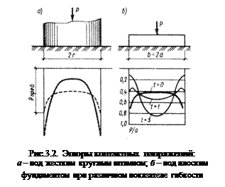 Теоретически эпюра контактных напряжений под жестким фундаментом имеет седлообразный вид с бесконечно большими значениями напряжений по краям. Однако вследствие пластических деформаций грунта в действительности контактные напряжения характеризуется более пологой кривой и у края фундамента достигает значений, соответствующих предельной несущей способности грунта (пунктирная кривая на рис. 3.2.а.)