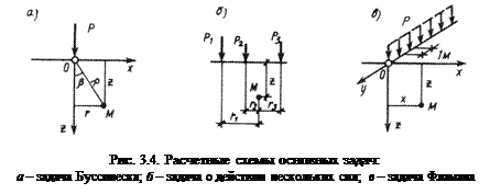 Решение задачи о действии вертикальной сосредоточенной силы, приложенной к поверхности упругого полупространства полученное в 1885 г. Ж. Буссинеском, позволяет определить все компоненты напряжений и деформаций в любой точке полупространства