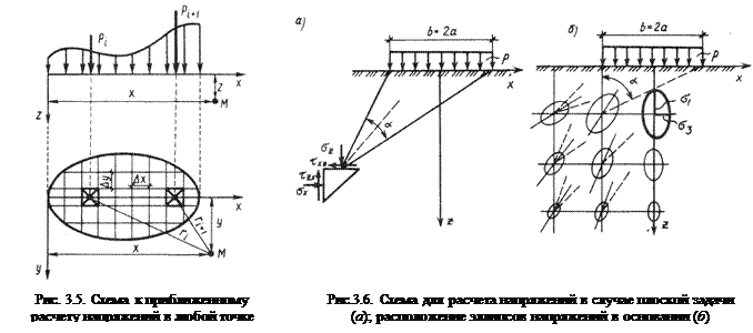 Зная закон распределения нагрузки на поверхности в пределах контура загружения, можно, интегрируя выражение (3.6) в пределах этого контура, определить значения напряжений в любой точке основания для случая осесимметричной и пространственной нагрузки (рис. 3.5.), а интегрируя выражение (3.8) – для случая плоской нагрузки.