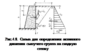 где При смещении стенки под действием давления в сторону от засыпки на величину u a (рис.4.7, а) в грунте засыпки формируется область обрушения грунта, граница которой называется поверхностью скольжения, а сама область – призмой обрушения. Давление, передаваемое призмой обрушения на грань стенки, называют активным давлением, а его результирующую обозначают Е а. При смещении стенки в сторону грунта под действием каких-либо сил в засыпке также образуются поверхности скольжения, при величине смещения + u п формируется призма выпирания грунта (рис.4.7, в). При этом реакция грунта достигает максимального значения и соответствует пассивному давлению (отпору) грунта, результирующую которого обозначают Е п. 4.6.1. Определение активного давления на вертикальную грань стенки для сыпучего грунта и связного грунта, учёт пригрузки на поверхности засыпки.