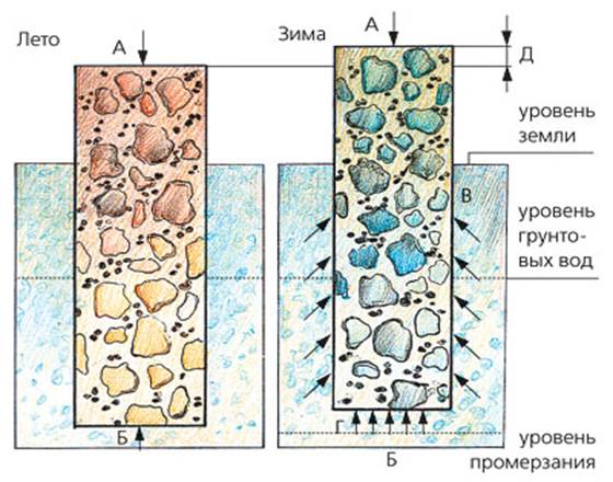 В насыщенных водой грунтах величина осадки фундамента возрастает в несколько раз, по сравнению с осадкой на грунтах с умеренной влажностью. В таких грунтах фундамент закладывают до глубины промерзания почвы. Стоит отметить, что в разных районах показатели глубины промерзания имеют разные значения. Так, в районе Омска и Новосибирска — 220 см, Екатеринбурге, Перми Челябинске, — 190 см, в районе Тобольска— 210 см, для Ижевска, Казани и Оренбурга этот показатель колеблется на отметке — 170 см, Москвы, Новгорода, Санкт-Петербурга, Твери, Воронежа — 140 см, в районе Уральска — 160 см, для Вологды, Костромы, Пензы, Саратова и Нижнего Новгорода — 150 см, в Волгограде, Гурьеве, Пскове, Смоленске и Курска — 120 см, для Астрахани и Ростова-на-Дону — 100 см. Конечно, нужно понимать, что это средние показатели. Надежнее всего получить справку от компетентных органов, свидетельствующую о глубине промерзания в районе строительных работ.