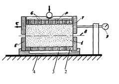 Рисунок 6 - Принципиальная схема односрезного плоскостного прибора прямого сдвига: 1 – образец грунта; 2 - фильтр; 3 - поддон; 4 – станина; 5 – неподвижное кольцо-обойма; 6 – фильтр-штамп; 7 – подвижное кольцо- обойма; 8 – плоскость сдвига; 9 – индикатор для замера деформаций сдвига