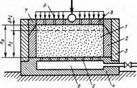 Рисунок 7 - Принципиальная схема компрессионного прибора (одометра): 1 – испытуемый образец; 2 – жесткое грунтоотборочное кольцо; 3 - обойма-корпус; 4 - поддон; 5 – фильтр; 6 - полость; 7 – направляющее кольцо; 8 – штамп-фильтр; Р – сжимающее давление
