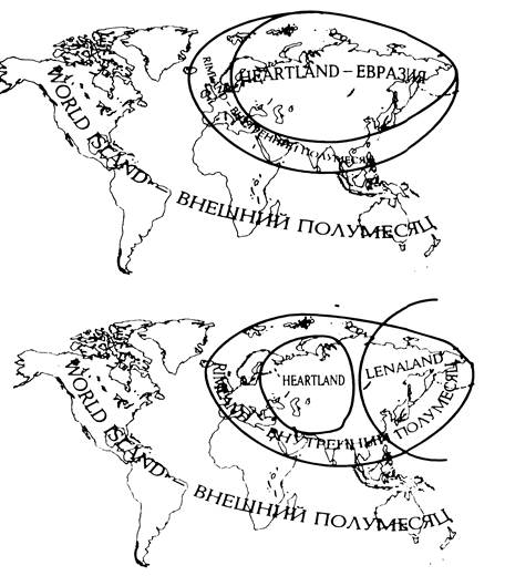 Схема: «Географическая ось истории» - варианты 1919 и 1943 годов.