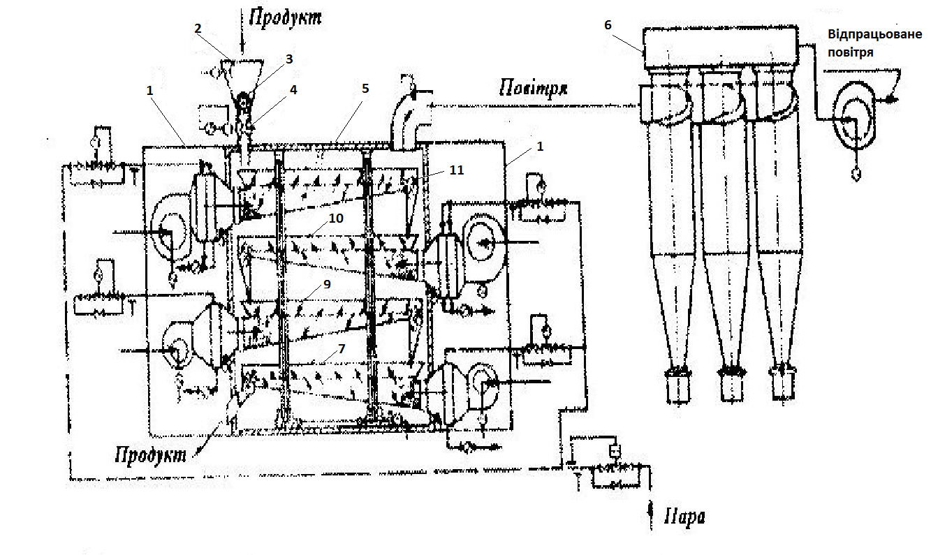 Рис. 9.4. Сушарка А1-КВР 1 - корпус; 2 – бункер; 3 – ворушитель; 4 – барабанний живильник; 5 – сушильна камера; 6 – батарея циклонів; 7 – металевий короб; 8 – поворотний поріг; 9, 10, 11 – металеві короба.