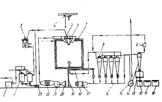 Рис. 9.5. Розпилююча сушильна установка А1-ОРЧ 1 – проміжні резервуари; 2 – гомогенізатор; 3 – бачок мийного пристрою; 4 – електростат; 5 – повітророзподільник; 6 – розпилювач; 7 – сушильна башта; 8 – циклони; 9, 15, 21 – вентилятори; 10 – машина для зашивання паперових мішків; 11 – ультразвукова установка для зварювання поліетиленових укладок; 12 – ваговий автоматичний дозатор; 13 – бункер; 14 – розвантажувач; 16 – пневмотранспорт на лінія; 17, 22 – калорифери; 18 – шнек; 19 – скребковий механізм; 20 – повітряний фільтр; 23 – гвинтовий насос.