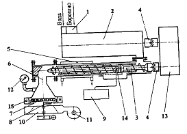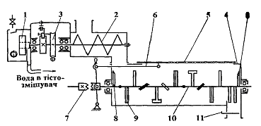 Рис. 11. 1 Схема шнекового макаронного преса ЛПЛ-2М 1 – тістовимішувач; 2 – дозатор води; 3 – редуктор з електродвигуном приводу дозаторів; 4 – дозатор борошна; 5 – пресуючи головка з матрицетримачем; 6 – ріжучий механізм з приводом; 7 – пристрій для обдувши; 8 – пресуючий корпус із шнеком та перепускним каналом; 9 – рама преса; 10 – редуктор привода преса.