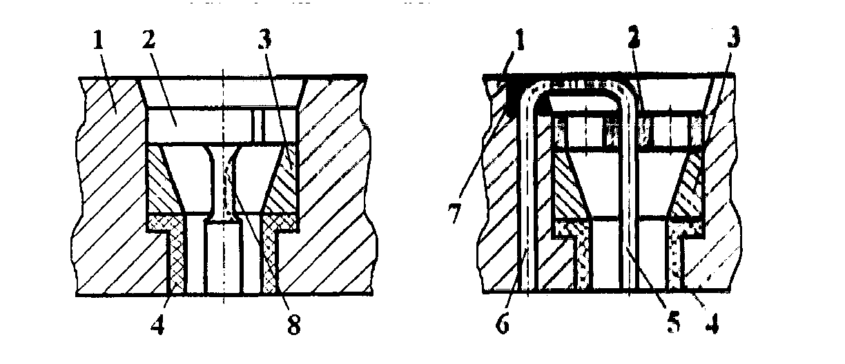 а) б) Рис. 11.5.Матриці макаронних пресів для формування трубчастих виробів: а – коротких; б – довгих; 1 – корпус; 2 – вкладиш; 3 – проміжне кільце; 4 – вставка з фторопласту або тефлону; 5 – трубка; 6 – отвір у корпусі матриці; 7 – місце пайки; 8 – виріз у вкладиші для формування зігнутих макаронних виробів.