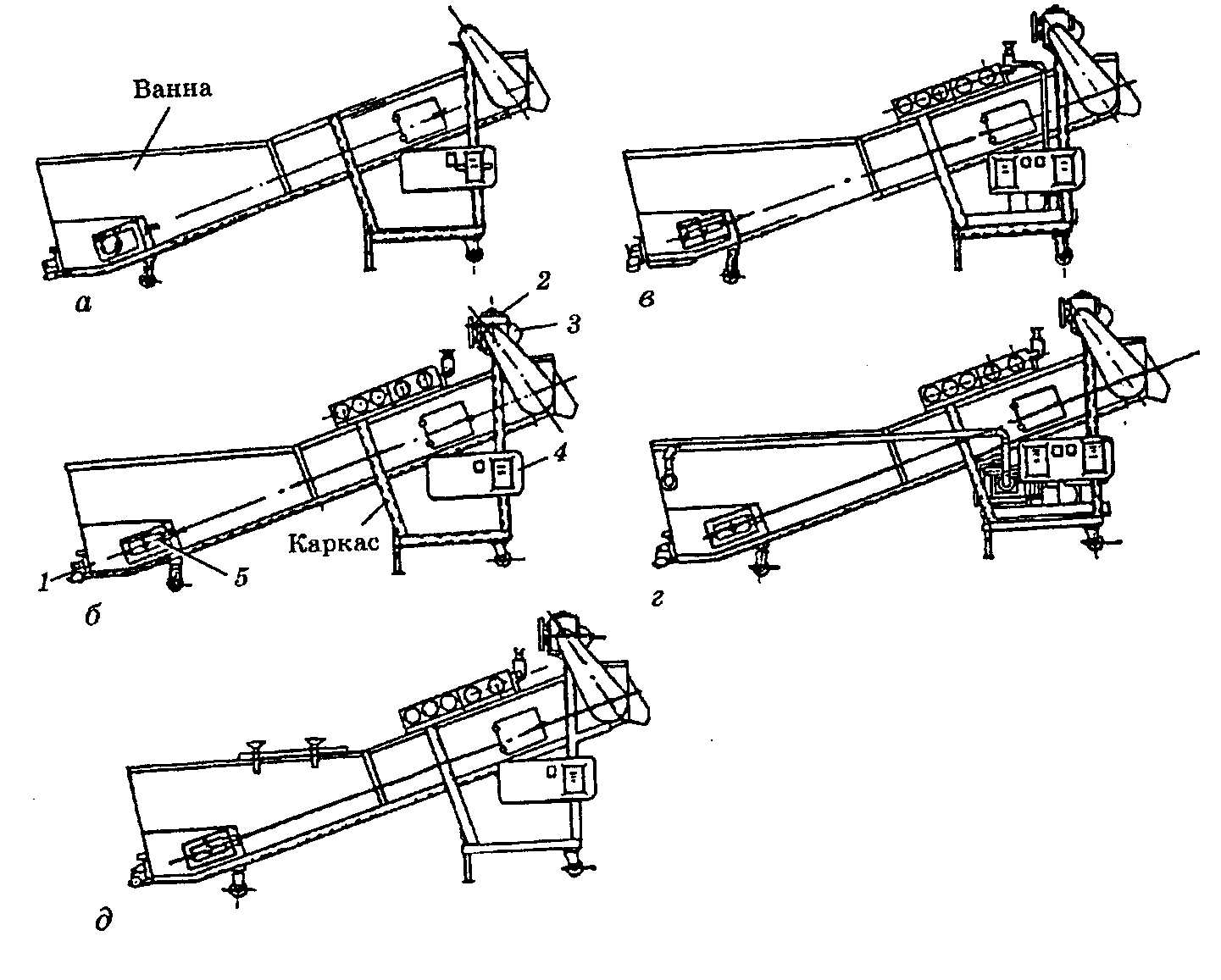 Рис. 13.1. Уніфіковані мийні машини КУВ: а – базова; б – з душовим пристроєм, в який вода подається з водопроводу; в – з насосом для подачі води в душовий пристрій під високим тиском; г – з компресором, що подає стиснене повітря в барботер, розміщений у ванні під верхньою стрічкою конвеєра, для турбулізації води у ванні; д – з щітками для жорсткого режиму миття баклажанів, кабачків, коренеплодів; 1 – кран; 2 – редуктор; 3 – електродвигун; 4 – пусковий пристрій; 5 – натяжна станція. Лопатеві мийні машини. Машина А9-КЛА-1 призначена для миття коренеплодів. Основу її (рис. 13.2) становить рама 2, виготовлена з листового прокату, яка складається із завантажувального бункера 1 і ванни 7 з трьома відсіками. Перший відсік 3 призначений для первинного миття продукції, тобто для відмочування бруду. У другому відсіку 8 розміщений барабан з перфорацією у нижній частині. У ньому здійснюється основне миття сировини і відокремлюється від неї бруд. Барабан кріпиться на валу 9, його положення фіксується двома фіксаторами 6. При санітарній обробці барабан може повертатись відносно вала. Барабан розміщений у ванні 7. Через отвори у перфорації бруд з барабана потрапляє у ванну, яка має два люки 20 і 11. Через вентиль видаляється вода, а через люки – бруд після санітарної обробки. У третьому відсіку 14 сировина ополіскується. Частина днища 13 цього відсіку має перфорацію для стоку води і бруду в основну ванну. У кінці першого і третього відсіків є колектори 5 і 16 з отворами для подачі води. Надлишок води видаляється з ванни через переливні збірники. На трубопроводі, що підводить воду до колекторів, встановлений запірний магнітний вентиль 19, зблокований з приводом машини, що перекриває подачу води в колектори при її зупинці. Люк 20 відкривається за допомогою системи важелів 21. На валу, який проходить через всі три відсіки, укріплені лопаті 12, якими сировина перевантажується і просувається вздовж відсіків. Вал приводиться в рух від двигуна-редуктора 17 через ланцюгову передачу 18 і обертається з частотою 25 хв-1. Всі три відсіки закриті знімними кришками 4, 10, 15.