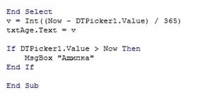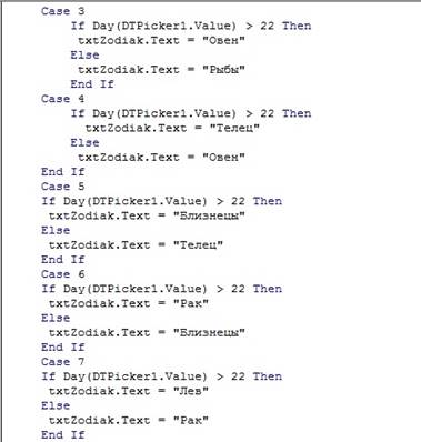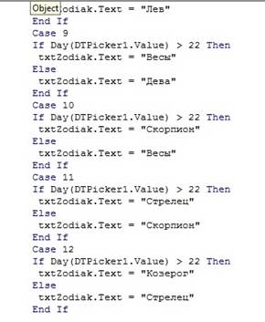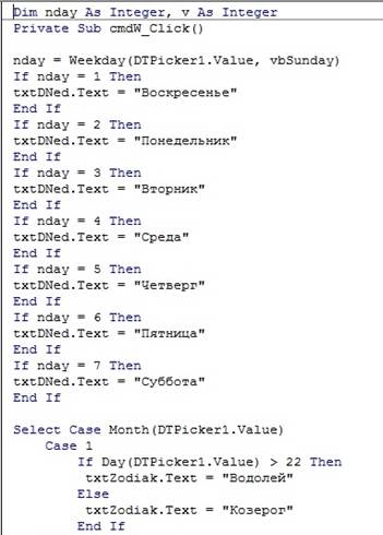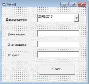 Пример. Разработать программное приложение, которое по вводимой пользователем датой рождения будет определять день недели рождения, знак зодиака, соответствующий дате рождения, и количество полных лет. Разработаем приложение с использованием компонентов Label, TextBox, CommandButton и нового компонента для отображения даты DTPicker.