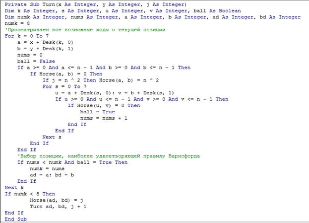 Цель работы: Изучение функций для графических построений План работы:Разработать алгоритм, используя алгоритмы цикла и ветвления Теоретический материал: Чтобы добавить объект MSFlexGrid на панель инструментов, выполните команду меню Project→Components и выберите из списка элементов управления (Controls) Microsoft FlexGrid Control и затем нажмите кнопку OK. После этого на панели инструментов появится новая пиктограмма. Таблица, получаемая при использовании средства управления FlexGrid, представляет собой форму, содержащую таблицу с горизонтальными строками и вертикальными столбцами. По умолчанию верхняя строка и крайний левый столбец резервируется для заголовков строк и столбцов и отображаются с фоновой заливкой. Вы можете использовать свойство Rows для задания количества строк в таблице, а свойство Cols для задания количества столбцов. Свойства Row и Col объекта MSFlexGrid также определяют и положение текущей ячейки. Пример. Реализовать рекурсивный алгоритм обхода шахматной доски конем. Для решения данной задачи на форму добавим компонент MSFlexGrid. Свойствам Rows и Cols установим значения = 8. Также добавим на форму 2 текстовых окна для ввода пользователем начальной ячейки обхода шахматной доски и командные кнопки Начала работы и Выхода.