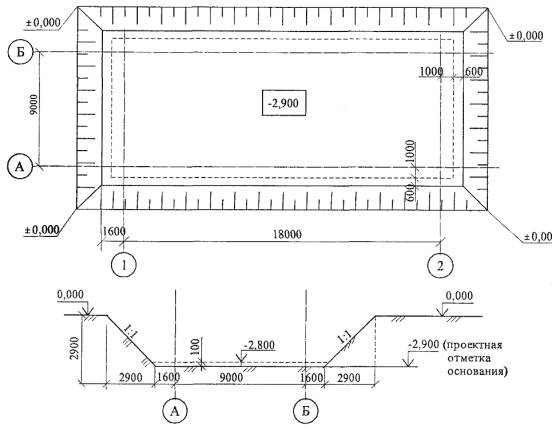 6.1. Технико-экономические показатели в технологической карте определены для случая разработки грунта II группы при отсутствии грунтовых вод с откосами 1:1 экскаватором с гидравлическим приводом, оборудованным ковшом обратная лопата вместимостью 1,0 м3, по рисунку 4 при геометрических размерах котлована по осям 1-2 - 18 м, по осям А-Б - 9 м.
