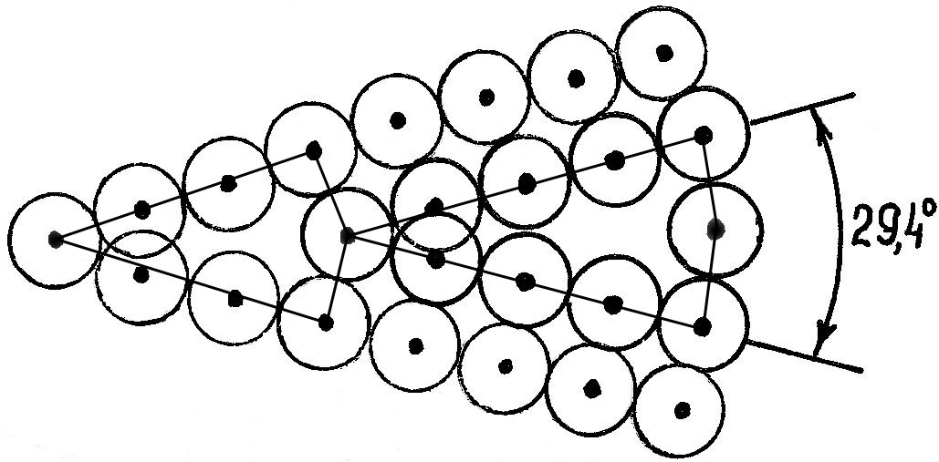 Если число атомов в «ступеньке» превышает 10, как показано рис. 3.4, то границу целесообразно представлять в виде стенки краевых дислокаций. Когда длина ступеньки составляет 6 атомов или меньше, для описания границы следует привлекать понятие РСУ. Ступенькам с малым целым числом атомов (6, 5, 4 и т. д.) соответствует небольшой размер элементарной ячейки решетки совпадения, т.к. при уменьшении длины ступеньки расстояние между узлами на вершинах, являющееся параметром РСУ, уменьшается. Соответственно углы разориентации θ; кристаллов растут достаточно быстро.