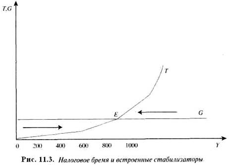 Законодательный орган определяет только ставки налогов, а не размер налоговых поступлений, так же как сумму выплаты по одному пособию, но не количество пособий. Суммарный объем налоговых поступлений и выплат по безработице определяется состоянием экономики. При помощи встроенных стабилизаторов в зависимости от экономической конъюнктуры изменяются налоговые поступления и государственные трансферты, таким образом, они сглаживают циклические колебания, но не устраняют их. В период спада встроенные стабилизаторы приводят к уменьшению налоговых поступлений в государственный бюджет, росту социальных выплат и дефициту государственного бюджета. В период подъема происходит обратный процесс. На рис. 13.3 представлен механизм действия такого встроенного стабилизатора, как прогрессивное налогообложение.