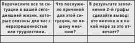 Впишите в таблицу как можно больше разных ситуаций и после этого ответьте на вопросы и запишите ответы в тетрадь: 1. Чаще всего в этих ситуациях сколько ответственности принадлежит, по вашему мнению, вам? Укажите цифру в процентном соотношении. 2. Сколько ответственности, по-вашему, принадлежит другим людям? Всего и по отдельности – запишите в процентах. 3. Сколько ответственности вы отдаете судьбе (звездам, погоде, богу, обществу в целом, правительству и так далее)? Запишите в процентах. Посмотрите на ваш результат. Если больше половины ответственности в ситуациях принадлежит вам – вы предполагаете, что другие люди не способны на то, на что способны вы. Если это так, то, вероятно, вам очень трудно живется, поскольку вы все время решаете чужие проблемы. Если больше половины ответственности вы отдаете другим участникам ситуации, то, скорее всего, вы не доверяете себе, предпочитая занимать позицию «я в домике»: не отвечаете за свои поступки и привыкли ждать, что «все как-нибудь само разрулится». Если вы отдаете судьбе больше 10 процентов, то, скорее всего, вы живете не свою жизнь, а жизнь, которую вам диктуют другие. Важно, что это вам по какой-то причине подходит.