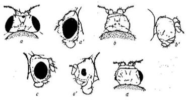 Рис. 1.22. Мутація eyeless у Drosophila melanogaster а, а' – нормальні очі; b, b' – зовсім безока форма; с, с' – проміжне вираження ознаки.