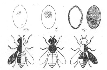 Співвідношення частин організму, що мають генотипи XX і ХО, залежить від того, коли втрачається кільцева X хромосома. Якщо, наприклад, вона втрачається при першому поділі ядра зиготи, то клітинні клони займають по половині бластодерми, якщо пізніше, то клон ХО займає меншу частину бластодерми. У рідких випадках кільцева X-хромосома втрачається при першому поділі й ще раз при більш пізніх поділах, у цих випадках в ембріонів клон ХО займає більшу частину бластодерми. Характер же мозаїцизму буде визначатися не тільки віссю першого поділу, але й характером міграції ядер до поверхні при утворенні бластули. Відносне положення ядер має тенденцію зберігатися, але все-таки при міграції ядра з генотипом ХО можуть мігрувати разом з ядрами з генотипом XX. Мігруючі ядра рівноспадкові, і при утворенні бластодерми місце, займане клітиною, в основному визначає її долю, тобто визначає ті структури, походження яким вона дасть. Цей механізм забезпечує появу різноманітних мозаїків. Нервова система й мезодерма, що дає початок м'язовій тканині, також утворюються зі специфічних районів бластодерми. Границі в мозаїків між «чоловічими» і «жіночими» частинами в основному збігаються з міжсегментальними границями й поздовжньою середньою лінією екзоскелету (Рис. 6.4.), тому що екзоскелет представляє собою сукупність багатьох частин, що утворюються незалежно в ході метаморфоза з імагінальних дисків личинки. Імагінальні диски, у свою чергу, утворюються зі специфічних районів бластодерми. Однак окремі клітинні групи усередині одного диска можуть бути також різного генотипу.