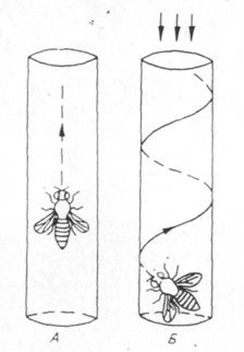 Рис. 6.5. Рух до джерела світла білатеральних мозаїків за фототаксисними мутаціями (А — нормальна муха; Б — білатеральний мозаїк з одним мутантним оком).
