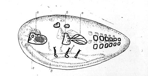 Рис. 6.6. Карта ембріональних зачатків на поверхні бластули (а - голова; б — груди; в — крило; г — головний мозок; д — вентральна нервова система).