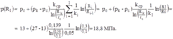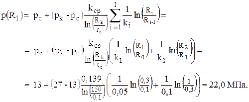 Ответ: kср = 0,139 10-12 м2; Q = 1,54 10-3 м3/с; p(R2) = 22,0 МПа; p(R1) = 18,8 МПа.