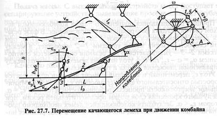 Качество работы качающегося лемеха зависит от конструктивных и установочных параметров: ширины bл и длины lл лемеха (рис. 27.6, и), углов γ; раствора лезвия и αп его наклона к горизонту (рис. 27.6, а), глубины h подкапывания, частоты со и амплитуды А колебаний (рис. 27.7). Ширина bл лемеха (см. рис. 27.6, и) определяется шириной гнезда залегания клубней, отклонением оси рядка от оси лемеха (из-за непрямолинейности рядка и неточности движения машины), глубиной подкапывания и углом естественного откоса клубней в почве. Обычно ширина одного лемеха bл =420...500 мм. Наряду со сплошными лемехами изготавливают секционные. Последние сепарируют часть почвы до подачи ее на элеваторы. Угол γ выбирают из условий резания лезвием лемеха стеблей и корневищ со скольжением γ ≤ π - 2φ;, где φ; - угол трения растений по металлу. При этом стебли легче перерезаются лезвием и быстрее сходят с лемеха, за счет чего снижаются забивание и сгружива-ние массы почвы. Для лемехов, закрепленных на раме машины, угол γ; = 80... 100°. При меньших значениях самоочищение улучшается. Однако с уменьшением угла γ; увеличивается длина lл. Секционные лемехи допускают меньшие значения угла γ; при заданной длине lл. Угол αп наклона лемеха к горизонту устанавливают таким, при котором соблюдается скольжение почвы по рабочей поверхности. Данное условие выполнимо при αп ≤ π/2 – φп где φп - угол трения почвы по металлу. Однако при малом αп ухудшается крошение почвы, что затрудняет ее последующую сепарацию, а также компоновку сепарирующих устройств, особенно при небольшой (8... 10 см) глубине подкапывания. В клубнеуборочных машинах с глубиной подкапывания пласта h = 18...25 см и неподвижными лемехами αп = 25...35°. По такому же принципу устанавливают пассивные лемехи и подкапывающие лапы корнеуборочных машин, извлекающих корнеплоды теребильными устройствами. Длина lл рабочей поверхности лемеха определяется углами γ; и αп, а также глубиной h. С учетом приведенных значений γ;, αп и h длину lл принимают равной 400...475 мм. Установлено, что длина lл существенно влияет на транспортирование пласта по рабочей поверхности лемеха. При большем ее значении происходит сгруживание массы перед орудием. Колеблющийся лемех при работе совершает сложное движение: перемещаясь относительно рамы машины по дуге радиусом lл со скоростью ωА, он движется весте с ней со скоростью VM. Учитывая, что радиус кривошипа А (амплитуда) значительно меньше lл и отношение А/ lл близко к нулю, возвратно-поступательное движение лемеха принимают прямолинейным, направленным под углом (α + β;) к горизонтальной плоскости. В результате сложного движения носок лемеха будет иметь пилообразную траекторию (точки 1-2-3-4-5) с высотой зубца hзуб = 2Asin (α + β;), поэтому для колеблющихся лемехов максимальную глубину подкапывания устанавливают больше, чем для неподвижных. Длина пути за один период колебаний L=2πVM / ω; Процесс подкапывания почвенного пласта колеблющимся лемехом состоит из двух фаз: резания и подбрасывания. В фазе резания лемех перемещается из точки 1 до точки 3 (рис. 27.7), при этом скорость резания между точками 1-2 возрастает, а между точками 2-3 - уменьшается. Угол резания определяется соотношением αр = α; -εр, где α; - угол наклона лемеха, а εр — угол между направлением движения лемеха и горизонталью. Угол εр переменный и в каждый момент времени определяется скоростью относит