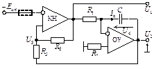 Рис. 92. Генератор треугольных импульсов на основе компаратора Схема генератора треугольных импульсов, показанная на рис. 92, характеризуется следующими состояниями его выходов: