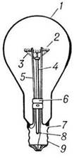 24. Конструкции ламп накаливания весьма разнообразны и зависят от назначения. Однако общими являются тело накала, колба и токовводы. Наиболее распространённым является из проволоки круглого поперечного сечения, однако находят применение и ленточные тела накала (из металлических ленточек). Поэтому использование выражения «нить накала» нежелательно — более правильным является термин «тело накала» Так как металлы имеют малое удельное сопротивление, для достижения такого сопротивления необходим длинный и тонкий провод. Толщина провода в обычных лампах составляет 40—50 микрон. Так как при включении нить накала находится при комнатной температуре, её сопротивление на порядок меньше рабочего сопротивления. Поэтому при включении протекает очень большой ток (в десять — четырнадцать раз больше рабочего тока). По этой причине часто лампы накаливания перегорают именно в момент включения. Но по мере нагревания нити её сопротивление увеличивается и ток уменьшается. В 1879 году американский изобретатель Т.А. Эдисон создал удобную для промышленного изготовления и достаточно долговечную конструкцию – лампу накаливания с угольной нитью. В начале 20 века появились лампы накаливания с зигзагообразной вольфрамовой нитью, а затем появились лампы накаливания, наполненные различными газами, вольфрамовая нить же стала спиралеобразной. Лампы накаливания делятся на следующие типы: · лампа накаливания с угольной нитью; · лампа накаливания с танталовой нитью; · лампа накаливания с вольфрамовой нитью (вакуумная);\ · лампа накаливания с вольфрамовой биспиралью (газополная, технический криптон); · лампа накаливания с вольфрамовой биспиралью (галогенная); · лампа накаливания с вольфрамовой плоской спиралью (галогенная).