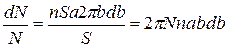 Знак «минус» в (А.6) обусловлен тем, что с увеличением b угол рассеяния убывает. Но так как далее нас будет интересовать лишь абсолютное значение db в функции от θ; и dθ;, знак минус учитывать не будем. Обозначим площадь поперечного сечения пучка α-частиц буквой S. Тогда количество атомов рассеивающей фольги на пути пучка равно nSa, где n – число атомов в единице объема, a – толщина фольги. Если считать, что α-частицы распределены равномерно по сечению пучка и число их велико, то количество частиц dN, пролетающих вблизи одного из ядер по траектории с прицельным параметром от b до b+db, будет равно