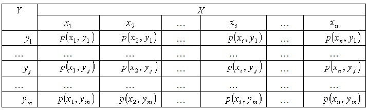 Первая строка таблицы содержит все возможные значения составляющей Х, а первый столбец – все возможные значения составляющей Y. В клетке, стоящей напересечений «столбца хi» и «строки yj», указана вероятность того, что двумерная случайная величина примет значение (хi, yj).