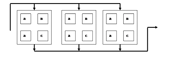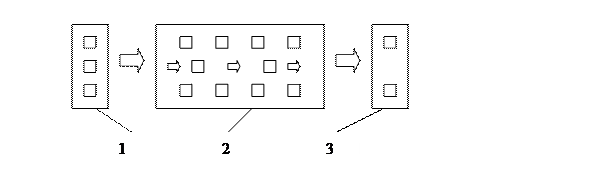 Решение о принятии той или иной компоновки должно быть оптимизировано. В качестве критерия оптимизации согласно теории массового обслуживания могут быть выбраны штучное время и коэффициент обслуживания оборудования: Ступенчатая с группами оборудования для предварительной обработки (1), основной обработки (2), окончательной обработки (3):