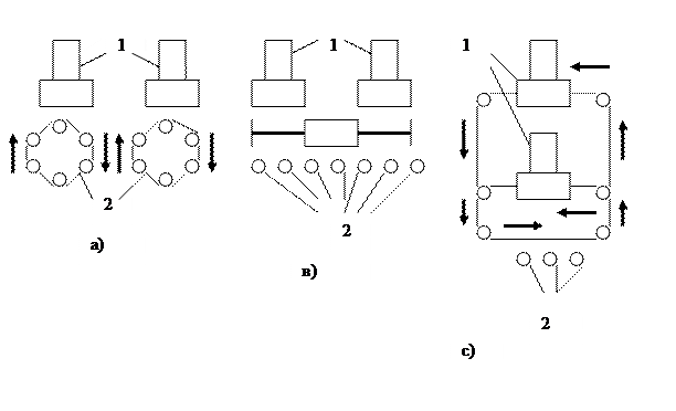 Здесь: 1 – многоцелевые станки; а) – с многопозиционными устройствами автоматической смены спутников, в) – с линейным потоком заготовок, с) – с кольцевым потоком заготовок; 2 – участок загрузки – выгрузки.