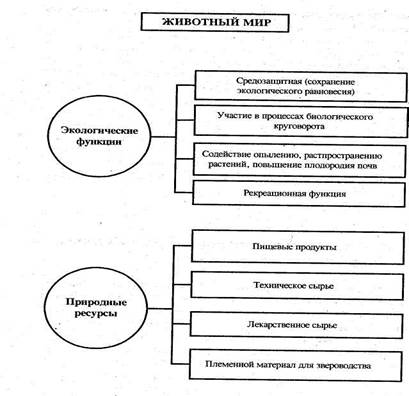 Леса — важная составная часть окружающей среды. Как экологическая система лес выполняет различные функции и одновременно является незаменимым природным ресурсом. По мнению специалистов, значение средозащитной функции леса, т.е. сохранность генофонда флоры и фауны, на порядок выше их экономического значения как источника сырья и продуктов. Влияние лесов на окружающую среду исключительно многообразно. Оно проявляется, в частности, в том, что леса: - являются основным поставщиком кислорода на планете; —непосредственно влияют на водный режим как на занятых ими, так и на прилегающих территориях и регулируют баланс воды; —снижают отрицательное воздействие засух и суховеев, сдерживают движение подвижных песков; —смягчая климат, способствуют повышению урожаев сельскохозяйственных культур; —поглощают и преобразуют часть атмосферных химических загрязнений; —защищают почвы от водной и ветровой эрозии, селей, оползней, разрушения берегов и других неблагоприятных геологических процессов; Воздействие человека на леса и вообще на весь растительный мир может быть прямым и косвенным. К прямому воздействию относятся: 1) сплошная вырубка лесов; 2) лесные пожары и выжигание растительности; 3) уничтожение лесов и растительности при создании хозяйственной инфраструктуры (затопление при создании водохранилищ, уничтожение вблизи карьеров, промышленных комплексов); 4) усиливающийся пресс туризма. Косвенное воздействие — это изменение условий обитания в результате антропогенного загрязнения воздуха, воды, применения пестицидов и минеральных удобрений. Проблема потери лесов одна из глобальных экологических проблем. За 7 тыс. лет истории планета потеряла 1/3 всех площадей лесов, сейчас ученые озабочены быстрыми темпами исчезновения лесов Бразилии, стран Малой Азии и Африки. Тропические леса - это кладовая разнообразия видов, из 3 млн. видов на земле 500 тыс. приходится на тропические леса. За последние 300 лет эти леса потеряли половину видового состава, в которых была заключена сильнейшая эволюционная информация. В целом, сокращение площадей, покрытых зеленой растительностью, или ее разреживание крайне нежелательны по двум причинам: во-первых, нарушается глобальный круговорот углерода в биосфере и, во-вторых, снижается интенсивность поглощения солнечной энергии биосферой в процессе фотосинтеза. Животный мир — это совокупность всех видов и особей диких животных (млекопитающих, птиц, пресмыкающихся, земноводных, рыб, а также насекомых, моллюсков и других беспозвоночных), населяющих определенную территорию или среду и находящихся в состоянии естественной свободы.