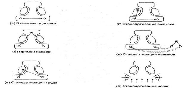 Всякая организованная человеческая деятельность задает два фундаментальных и противостояние друг другу требования: необходимость разделения труда для выполнения различных задач и потребность в его координации в рамках целостного процесса. А потому организационные структуры могут определяться и в зависимости от способа разделения труда и координации деятельности. 1.Взаимная подгонка достигается координацией труда посредством простого и информационного обмена. Выполняющие отдельные задания сотрудники в процессе общения согласовывают свои действия, подобно тому, как два гребца в одной лодке вынуждены подстраивать друг под друга скорость гребков и интенсивность своих усилий. На рис. 2 (а) процесс взаимной подгонки изображен в виде двунаправленной стрелки между двумя операторами. Данный метод находит применение в организациях с простой структурой и представляет собой наиболее очевидный способ координации действий. Однако парадоксальным образом он используется и в самых сложных случаях, поскольку только он позволяет обеспечить необходимую степень надежности действий в исключительно ответственных ситуациях, таких как, например, первый полет человека на Луну. 2. Прямой надзор предполагает, что координацию осуществляет индивид, отдающий распоряжения и приказы другим сотрудникам. Данный метод используется в случаях, когда над решением определенной рабочей задачи трудится некоторое число людей. Например, атакующие на своей шхуне мирный корабль пятнадцать пиратов не имеют возможности сообразовывать действия посредством взаимной подгонки, поэтому им необходим лидер, который направляет общие усилия при помощи команд. На рис. 2 (б) изображен лидер, отдающий распоряжения другим сотрудникам (направленные к операторам стрелки). 3. Координация может быть также достигнута при помощи стандартизации, когда единство деятельности достигается почти автоматически на основе соблюдаемых всеми сотрудниками правил. Можно указать четыре формы стандартизации — стандартизация процесса труда как такового; стандартизация выпуска; стандартизация знаний и навыков на «входе» рабочего процесса; стандартизация норм как более общее руководство деятельностью. 3.1.Стандартизация процесса труда означает спецификацию, или, что то же самое, программирование непосредственного содержания деятельности, задание процедур, которым необходимо следовать (например, прилагаемые к большинству детских игрушек инструкции). Как показано на рис. 2 (в), та 3.2.Стандартизация выпуска означает спецификацию не процесса труда, а его результатов, что позволяет достичь высокой согласованности различных видов деятельности. Руководителю нет необходимости указывать слесарю, где именно должны быть просверлены отверстия во фланце, с тем чтобы они совпали с болтами, приваренными кем-то другим, как не нужно объяснять менеджеру подразделения, что он должен приложить усилия к увеличению объема продаж на 10%, для того чтобы корпорация в целом достигала плановых показателей. И вновь такого рода стандарты исходят прежде всего от аналитика (см. рис. 2 (г)). 3.3.Стандартизация навыков — еще один, хотя и несколько менее эффективный, способ обеспечения координации действий. В этом случае стандартизация затрагивает не рабочий процесс или его результаты, а, скорее, работника, кот