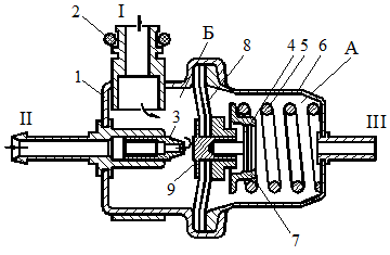 Регулятор давления топлива, рис. 9, обеспечивает постоянное рабочее давление в форсунках. Состоит из корпуса 1 и крышки 6, разделенных диафрагмой 8 с клапаном 9. Вакуумная камера А соединена с вакуумным ресивером патрубком III, топливная камера Б с топливопроводом двигателя I. Патрубок II соединяет камеру Б с топливным баком.