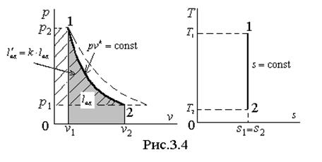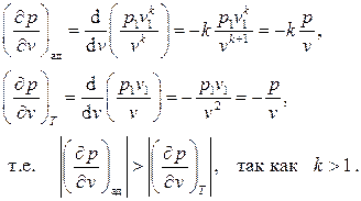 Изображение обратимого адиабатического процесса в термодинамических диаграммах показано на рис.3.4. Пунктирной линией на диаграмме p – v показан изотермический процесс, который изображается более пологой, чем адиабата кривой. В самом деле, сравнивая производные от давления по объему для адиабаты и изотермы, получаем