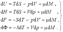 До сих пор нами рассматривались закрытые системы, в которых масса оставалась постоянной. Однако очень часто приходится иметь дело с системами, в которых число частиц и масса переменны (открытыми системами). Причинами изменения массы являются массообмен через оболочку системы, фазовые превращения, излучение, химические реакции, ядерные реакции. Пусть однокомпонентная однофазная термодинамическая система является открытой, однородной и равновесной. Изменение внутренней энергии такой системы будет происходить не только вследствие подвода теплоты и совершения над ней работы, но также и вследствие изменения ее массы в силу того, что вещество, проникающее через оболочку, обладает энергией, а фундаментальные уравнения Гиббса для термодинамических потенциалов следует дополнить еще одним слагаемым, пропорциональным изменению массы системы: