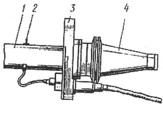 Рисунок 3 - Измерительная головка Одноконтактная однокоординатная измерительная головка (рисунок 3) позволяет опознать соответствующую заготовку по характерным для нее поверхностям, контролировать точность установки (базирования) приспособления-спутника или заготовки, измерять размеры, а также отключения формы различных поверхностей. Она предназначена для работы на многоцелевых станках с ЧПУ сверлильно-фрезерно-расточной группы. Такая измерительная головка выполнена в виде переходной оправки 1 с закрепленным в ней виброконтактным датчиком 2 и устройством 3 электрической связи с автономным электронным отсчетным устройством или с устройством ЧПУ станка. Головку, закрепленную в стандартной шпиндельной оправе 4, устанавливают в инструментальный магазин, и для необходимых измерений автооператор магазина подает ее в шпиндель станка. На производстве используются также двухконтактные, двухкоординатные и другие измерительные головки, которые без измерительной системы станка или совместно с ней определяют диаметры заготовок и отклонения формы их отверстий, контролируют межцентровые расстояния, расстояния между плоскостями заготовки, отклонения положения приспособления-спутника или заготовки на станке, смещение точки позиционирования шпинделя станка от расчетной точки, отклонения формы прямолинейных и цилиндрических поверхностей и т.д. Контрольно-измерительные операции вне станка. Контрольно-измерительные операции могут проводиться на КИМ. Они отличаются более высокими производительностью и точностью измерений, чем у металлорежущих станков, на которых выполняется контроль, но гораздо дороже последних.