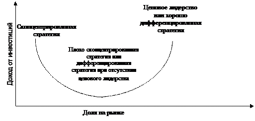 Общая стратегическая модель Портера рассматривает две основные концепции планирования маркетинга и альтернативы, присущие каждой из них: выбор целевого рынка (в рамках всей отрасли или отдельных сегментов) и стратегическое преимущество (уникальность или цена). Объединяя эти две концепции, модель Портера идентифицирует следующие базовые стратегии: преимущество по издержкам, дифференциация и концентрация. Используя стратегию преимущества по издержкам, фирма ориентируется на широкий рынок и производит товары в большом количестве. При помощи массового производства она может минимизировать удельные издержки и предлагать низкие цены. Это позволяет иметь более высокую долю прибыли по сравнению с конкурентами, лучше реагировать на рост себестоимости и привлекать потребителей, ориентирующихся на уровень цен. Используя стратегию дифференциации, фирма нацеливается на большой рынок, предлагая товар, который рассматривается как выделяющийся. Компания выпускает привлекательный для многих товар, который тем не менее рассматривается потребителями как уникальный в силу его дизайна, характеристик, доступности, надежности и т.д. В результате цена не играет столь важной роли, и потребители приобретают достаточную лояльность к товарной марке. В рамках стратегии концентрации компания выделяет специфический сегмент рынка через низкие цены или уникальное предложение. Она может контролировать издержки посредством концентрации усилий на нескольких ключевых товарах, предназначенных для специфических потребителей, создании особой репутации при обслуживании рынка, который может быть неудовлетворен конкурентами.