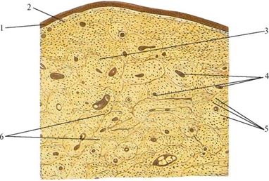 Строение компактного вещества: 1 — надкостница, 2 — циркулярные пластинки, 3 — трубки остеонов, 4 — гаверсовы каналы, 5 — остеоциты, 6 — вставочные пластинки. Каждый остеон образован несколькими трубками промежуточного вещества, вставленными одна в другую. В центре остеона имеется канал (гаверсов канал), по которому проходит кровеносный капилляр. Гаверсовы каналы соединяются между собой и с поверхностью кости короткими поперечными каналами — каналами Фолькмана. Через эти каналы в кость проникают сосуды (питание кости) и нервные волокна. Оссеиновые волокна остеона ориентированы в разных направлениях, что обеспечивает прочность кости. Остеоны не соприкасаются друг с другом. Между ними имеются вставочные пластинки, которые объединяют все остеоны в единое целое. Вставочные пластинки — остатки разрушенных остеонов, которые служат материалом для образования новых остеонов.