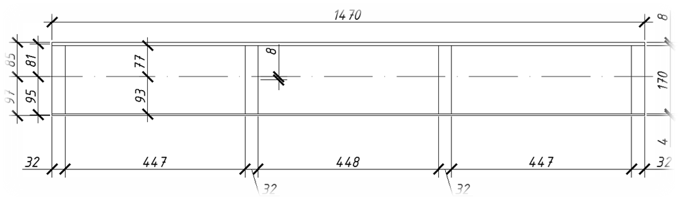 Ізв=((3,2•173/12)+0,82•3,2•17)•4+((147•0,83/12)+8,12•0,8•147)+((147•0,43/12)+9,52•0,4•147)= =1344,9•4+7722+5307,5=18409см4. Перевірка прийнятих розмірів перерізу за умови жорсткості плити