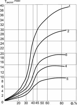 Рис. 2. Физический износ слоистых конструкций (срок службы 10-50 лет) n - число слоев. Пример оценки физического износа слоистой конструкции приведен в справочном прил.1. 1.7. Физический износ внутренних систем инженерного оборудования зданий в целом должен определяться по табл. 64-71 на основании оценки технического состояния элементов, составляющих эти системы. Если в процессе эксплуатации некоторые элементы системы были заменены новыми, физический износ системы следует уточнить расчетным путем на основании сроков эксплуатации отдельных элементов по графикам, приведенным на рис. 3 - 7. За окончательную оценку следует принимать большее из значений.