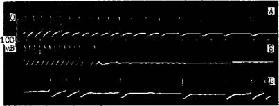 100 мс -80- Рис. 8. Механизмы, изменяющие частоту синусового ритма. Замедление синусового ритма при смещении порогового потенциала (ПП) от ПП-1 до ПП-2 (от б к в); замедление синусового ритма при увеличении максимального диастолического потенциала от а до д (по В. Hoffman, P. Cranefield). жат уменьшение скорости спонтанной диастолической деполяризации, гиперполяризация автоматических меток и смещение их порогового потенциала возбуждения к менее отрицательным величинам за счет того, что эти клетки подвергаются активации, более частой, чем их собственная частота возбуждения. М. Vassalle (1977, 1985) показал, что торможение автоматизма при OS связано с тем, что Na+-K+-Hacocy мембраны требуется сравнительно много времени для удаления накопившихся в клетках ионов Na+. Еще один механизм, ограничивающий функцию скрытых водителей ритма, — электротоническое взаимодействие между сократительными и автоматическими клетками. В гл. 1 были представлены соображения A. Wit и P. Cranefield (1982) об электротоническом угнетении автоматизма клеток АВ узла предсердными клетками. Изменения нормального автоматизма в СА узле или в скрытых автоматических центрах являются причиной возникновения таких аритмий, как: синусовые тахикардия, бради-кардия, аритмия, медленные (замещающие) и ускоренные выскальзывающие комплексы и ритмы (пред-сердные, атриовентрикулярные и идиовентрикулярные), миграция наджелудочкового водителя ритма, А В диссоциация. АНОРМАЛЬНЫЙ АВТОМАТИЗМ Впервые этот вид автоматической активности был обнаружен S. Imani-shi (1971) на препаратах волокон Пуркинье. Напомним, что физиологическая спонтанная диастолическая деполяризация в волокнах Пуркинт.р начинается от высокого уровня максимального диастолического потенциала (80—90 мВ) ("high potential automacity"). Она обеспечивает выработку за 1 мин ^30—40 импульсов (при физиологической концентрации ионов К+) и возрастание импуль-сации до 100 в 1 мин под воздействием адреналина. Другая форма спонтанной диастолической деполяризации, названная анормальным автоматизмом, начинается в тех же клетках при их частичной деполяризации, т. е. снижении их максимального диастолического потенциала до 60— 40 мВ ("low potential automacity") [Cranefield P., 1975]. Такого рода явление можно наблюдать в препарате волокон Пуркинье собаки, обработанном бария хлоридом, а также в сохранивших жизнеспособность субэндокардиаль-ных волокнах Пуркинье сердца животного через 24 ч после перевязки венечной артерии и развития острого инфаркта миокарда [Сосунов Е. А. и др., 1990; Dangman К., Hoffman В., 1980, 1985]. Спонтанно возникающим ПД присущ медленный электрический ответ, что связано с низким уровнем мембранного потенциала покоя поврежденных клеток Пуркинье. Частота же их автоматического ритма лыше физиологической, т. е. свойственной этим клеткам [Gilmonr R., 7л- pes D., 198-1]. Ряду авторов удавалось вызвать анормальную автоматическую активность в частично деполяризованных сократительных клетках предсердий и желудочков [Surawitz В., Imani-shi S., 1976; Katzung B. et al., 1977, 1985]. D. Singer и соавт. (1981) находили аналогичную по характеру активность в ткани предсердий, резецированной у больных, страдавших приступами очаговой (фокусной) ггредсердной тахикардии. Рассматривая механизмы анормального автоматизма, В. Katzung и соавт. (1985), указывают на то, что его главным компонентом является зависящий от времени выходящий К+ ток ik. Однако имеются данные об учас
