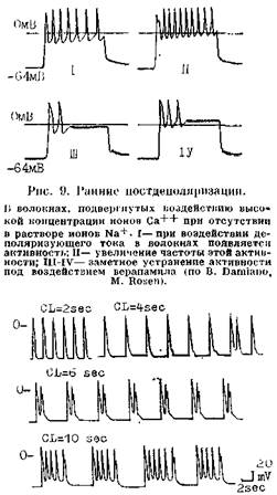Рис. 10. Ранние постдеиоляризации. Влияние длины цикла стимуляции (CL) на вон иикшшоние ранних ностдшюляризаций и трштерного ритма: но море, удлинения цикла возрастает число ранних лостденоля-риуаций (но В. Damiano, M. Rosen). стимуляции. В эксперименте можно видеть, как при остановке реполяризации в фазе 2 или 3 ПД сначала регистрируются низкоамплитудные под-пороговые колебания мембранного потенциала, направленные кверху, т. е. в сторону более положительных потенциалов. Если частота основного ритма понижается, то происходит постепенное возрастание амплитуды ранних постдеполяризаций (в основном второго подвида). Достигнув порога возбуждения, одна из них вызывает образование нового ПД еще до окончания исходного ПД. Этот преждевременный ПД рассматривается как триггерный, наведенный, ш>~ скольку он обязан своим возникновением ранней постдеполяризации, исходящей от основного ПД. В свою очередь, второй (наведенный) ПД может за счет своей ранней постдеполяризации вызвать третий, тоже триггерный ПД, а третий ПД стимулирует четвертый триггерный ПД и т. д. Следовательно, закрепляется пусковая ритмическая активность клеточной мембраны с различным числом импульсов. Надо учитывать, что при чрезмерном урежении основного ритма (или частоты стимуляции) амплитуда ранних постдеполяризаций начинает понижаться, и вероятность появления триггерного ритма уменьшается [Rosen M., 1986]. Триггерный ритм, вызванный ранними постдеполяризациями, не подвергается сверхчастому подавлению при коротком периоде стимуляции, но он может быть подавлен при более продолжительном периоде сверх частой стимуляция. Преждевременным экстрастимулом удается устранить такой триггерный ритм, если происходит гиперполяризация мембраны. В общем, триггерные ритмы этого типа исчезают в тот момент, когда по какой-либо причине полностью завершается процесс реполяризации, т. е. мембранный потенциал возвращается к своей максимальной физиологической величине (75—90 мВ). Естественно, возникает вопрос о причинах, ведущих к задержке реполяризации, образованию ранних постдеполяризаций и триггерных ПД. Ответ мы находим в исследованиях D. Gadsby и P. Granefield (1977), обнаруживших два уровня мембранного потенциала, при которых волокнам Пуркинье свойственна устойчивая электрическая активность. Первый уровень равен —90 мВ, т. е. нормальному потенциалу покоя. Второй уровень соответствует —60 мВ, т. е. зоне триггерной активности. Остановка ре-поляризации на последнем уровне и образование ранних постдеполяризаций являются, согласно экспериментальным данным В. Damiano, M. Ro- sen (1984), характерным ответом клеток на различные факторы: гиперка-техолемию, гипокалиемию, ацидоз, гипокальциемию, ишемию, воздействие аконитина, N-ацетилновокаина-мида, соталола, цезия хлорида и др. Перерастяжение волокон Пуркинье при большом расширении или аневризме левого желудочка тоже создает условия для триггерных возбуждений. Полагают, что следствием этих влияний бывает усиление входящего устойчивого деполяризующего тока, чувствительного к ТТХ (так называемого «тока Na+ окна») в фазе плато с удлинением ПД, вместе с торможением фазы 3 реполяризации, что, по-видимому, зависит от изменений тока ik, [Coulombe A. et al., 1985]. Еще раньше P. Cranefield (1977) показал, что колебания потенциала в фазах 2 и 3 реноляризации удается подавить верапамилом; в этом факте